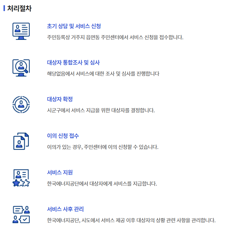 복지로 로그인 > 서비스 신청 > 복지서비스 신청 > 복지급여 신청 > 저소득층 > 에너지바우처 - 처리절차
